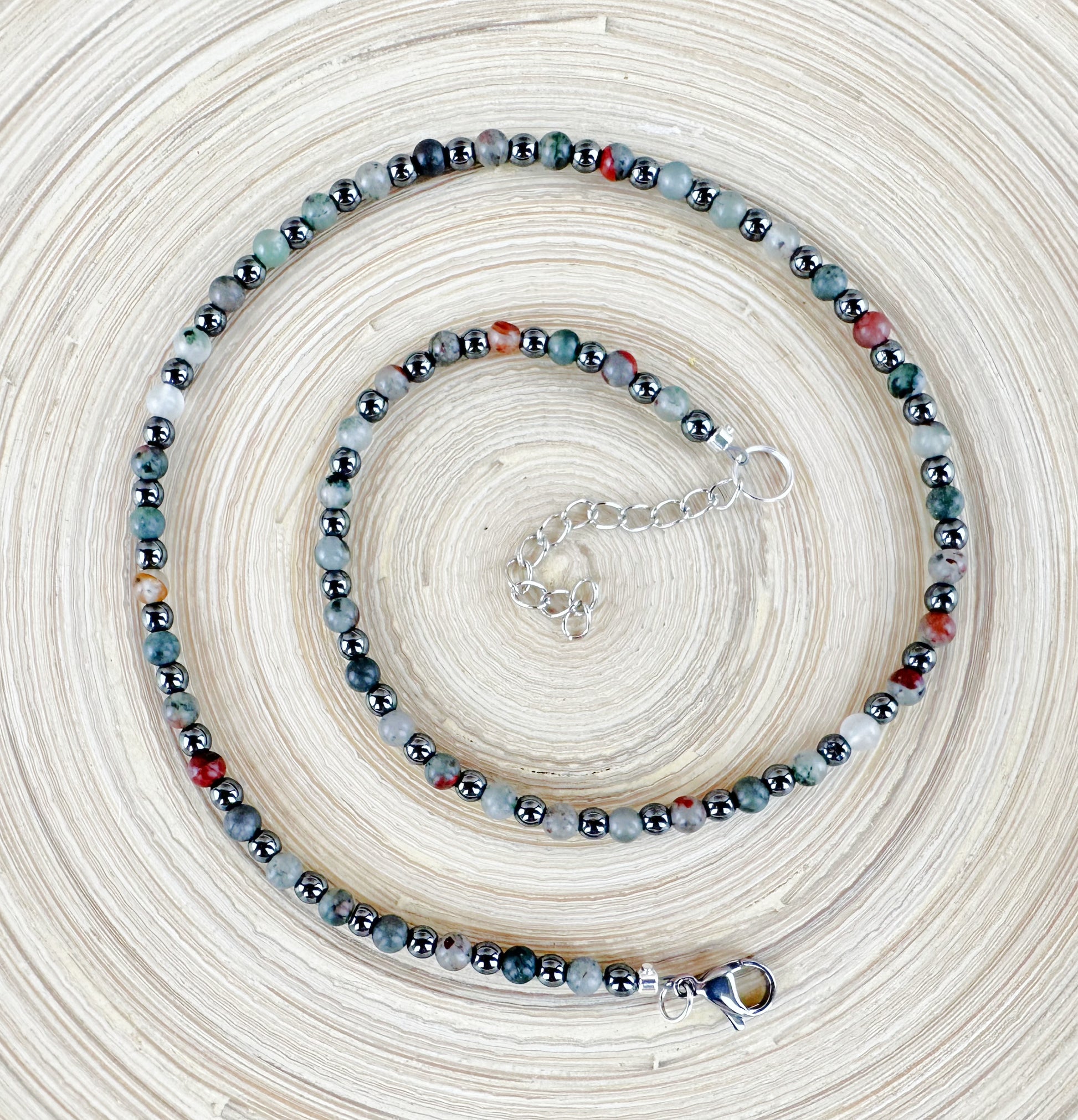 African Bloodstone & Hematite 4mm Natural Stone Necklace – 20” Handmade Crystal Necklace for Grounding & Strength