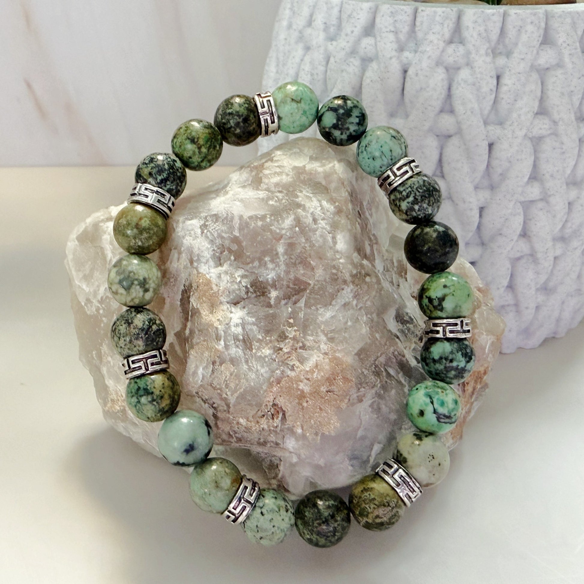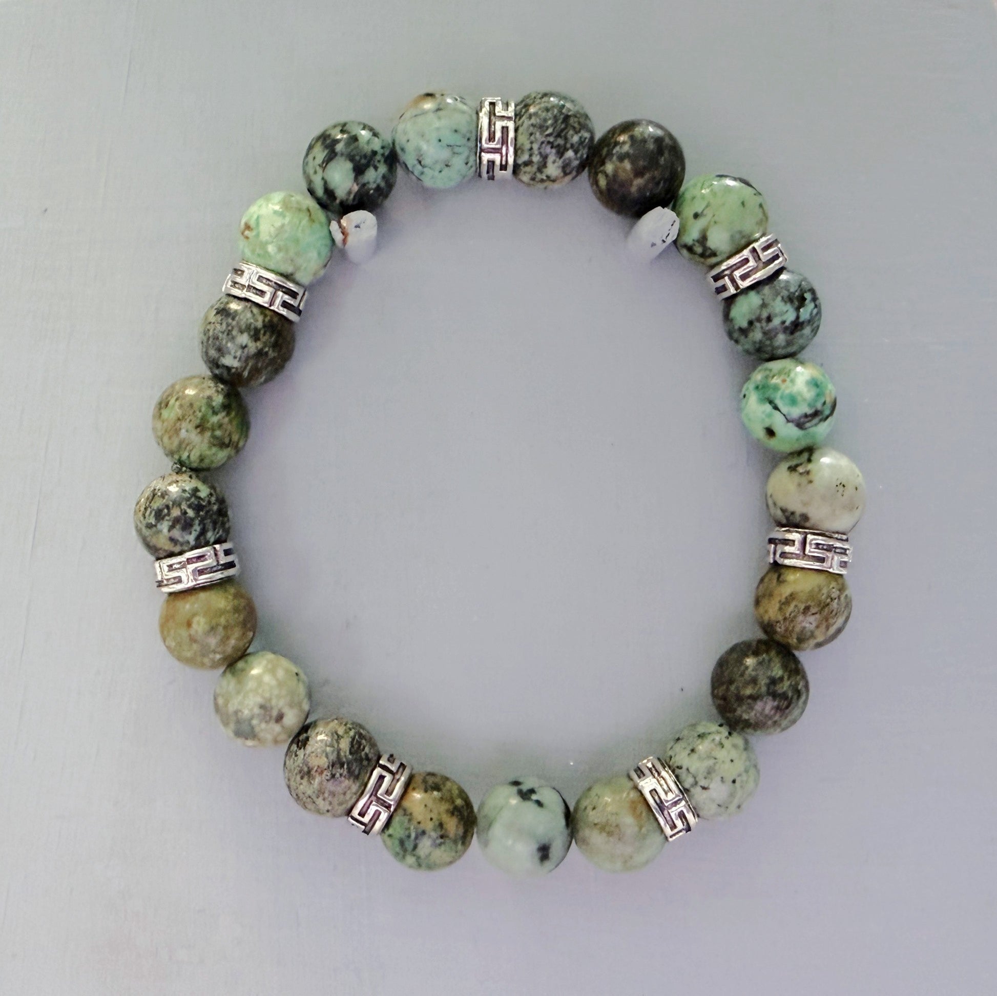 Embrace natural beauty with this African Turquoise stretch bracelet, featuring 8mm gemstone beads in earthy greens and browns. Each bead showcases the unique patterns and colors found in nature, making every bracelet one-of-a-kind. Polished silver accents add a touch of elegance and complement the warm tones of the stone. Designed for comfort and easy wear, the stretch band fits most wrists effortlessly. Perfect for everyday styling or layering with other pieces, this handcrafted bracelet brings grounding, earthy energy to your jewelry collection.
