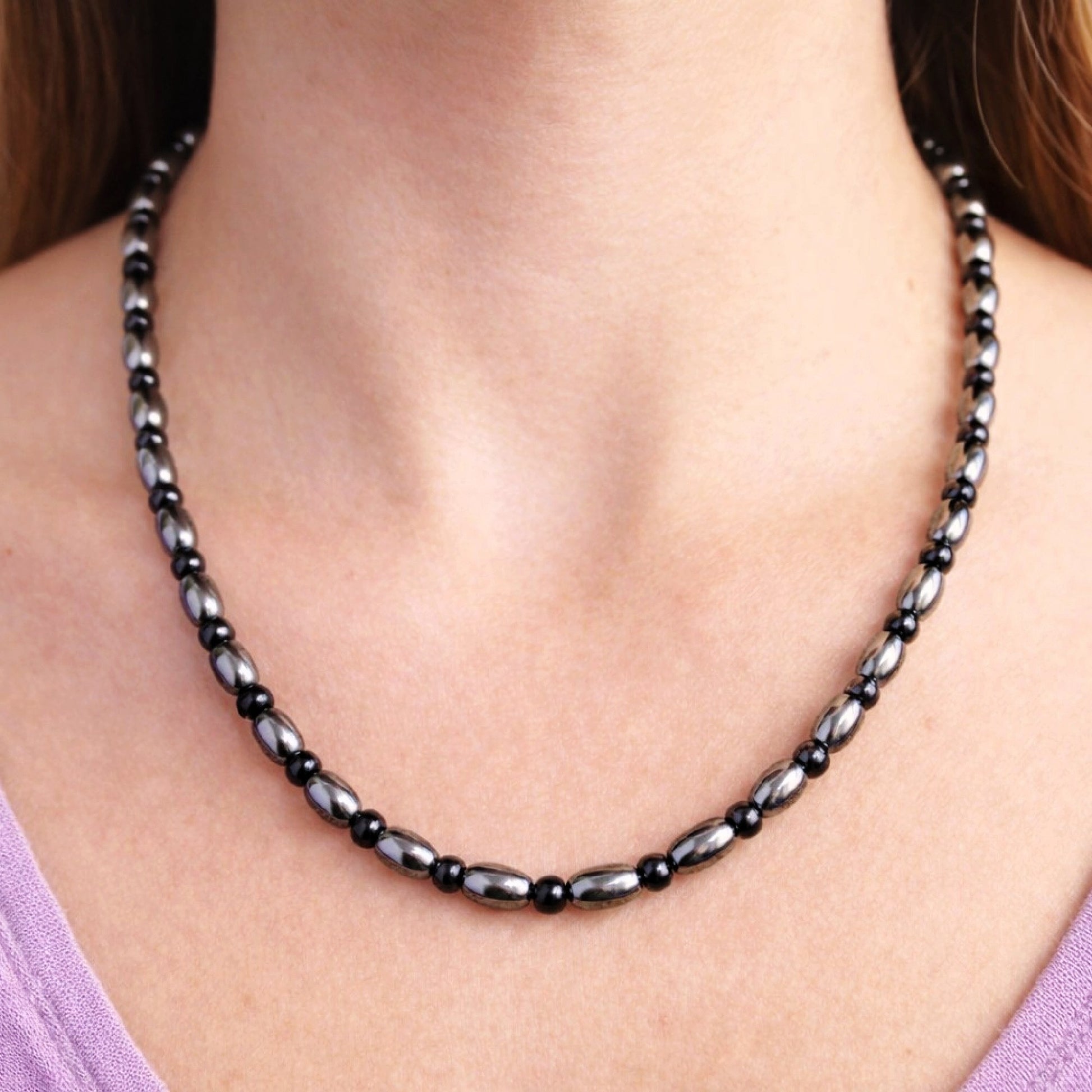 Designed for both versatility and meaning, this handcrafted necklace features genuine 4mm Black Onyx and Hematite beads in a polished finish, creating a modern black and silver combination that pairs effortlessly with any outfit.