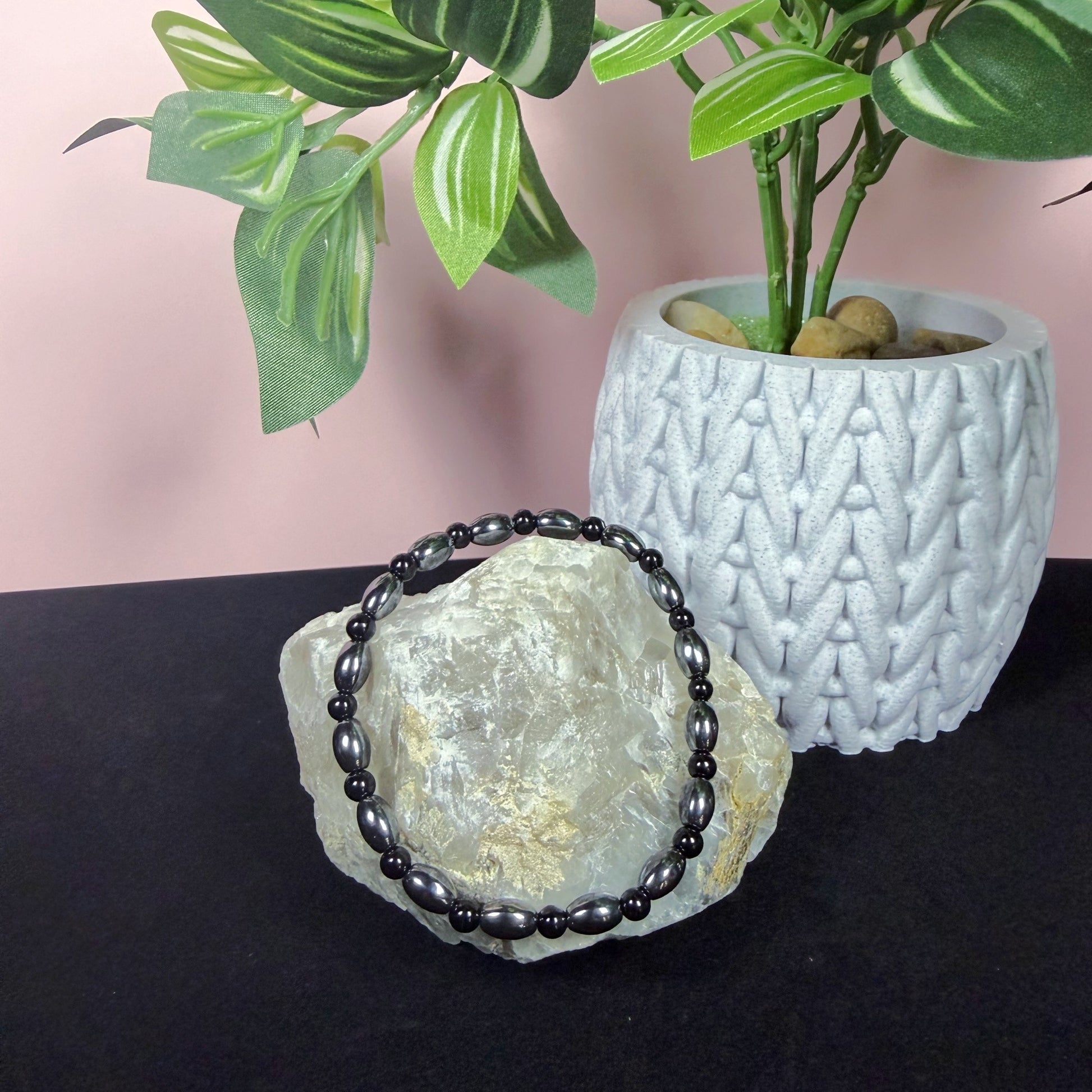 Handcrafted with genuine 4mm Black Onyx and Hematite beads, this bracelet features a timeless black and silver combination that offers both modern style and meaningful energy.
