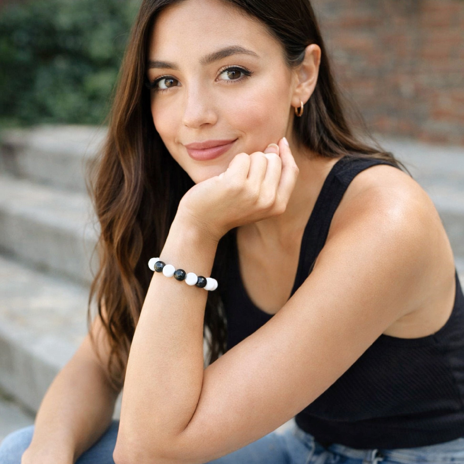 Designed on a durable stretch cord, this bracelet is comfortable for everyday wear and perfect for stacking or wearing solo. Its neutral black-and-white color palette makes it a versatile accessory for both men and women.