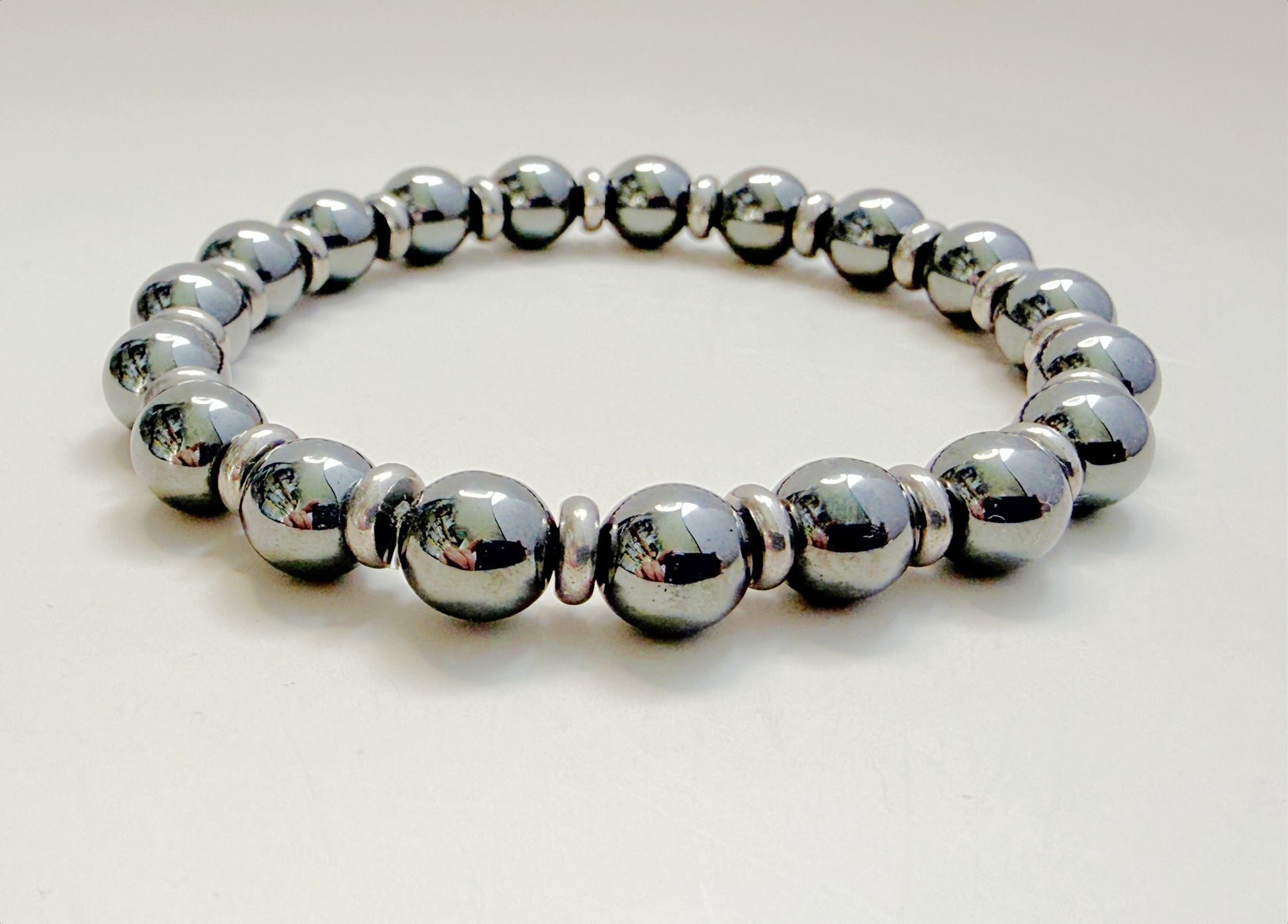 The polished metallic sheen of hematite pairs beautifully with the silver accents, making this bracelet versatile enough for both casual and dressy looks. Strung on strong, high-quality elastic, it’s designed for comfort, durability, and long-lasting wear.