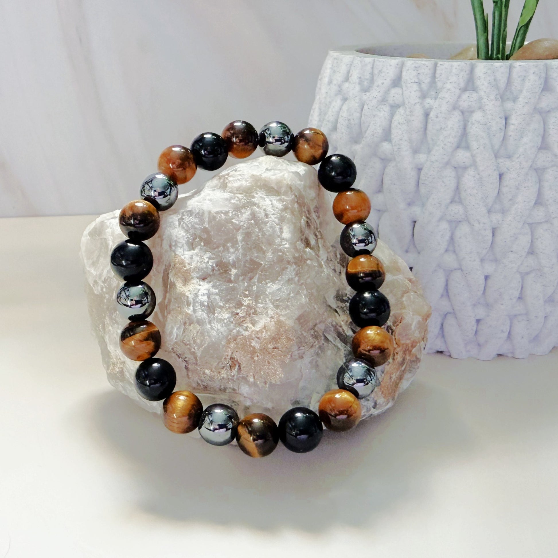 Tiger Eye, Hematite & Black Obsidian 8mm Natural Bead Bracelet -Triple Protection