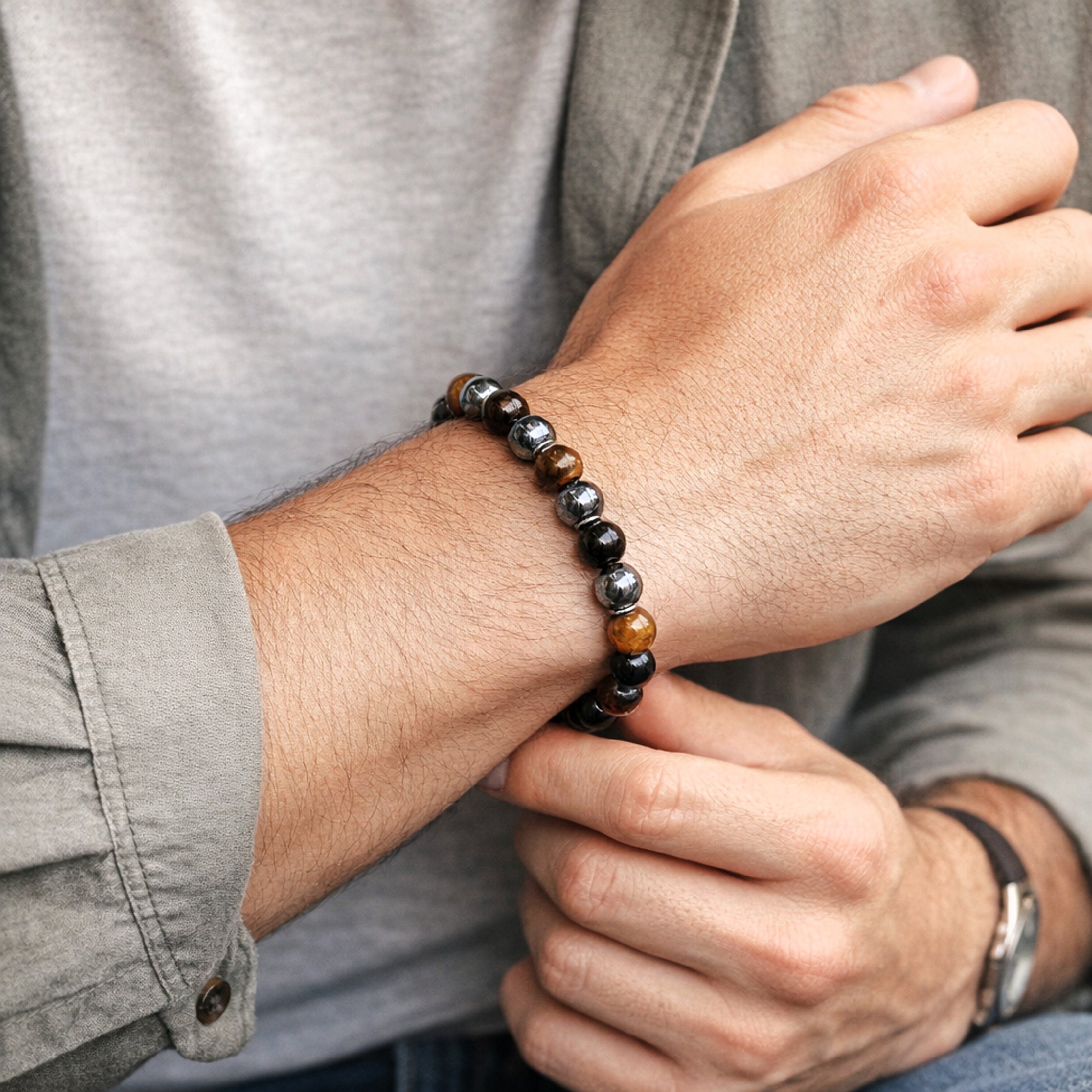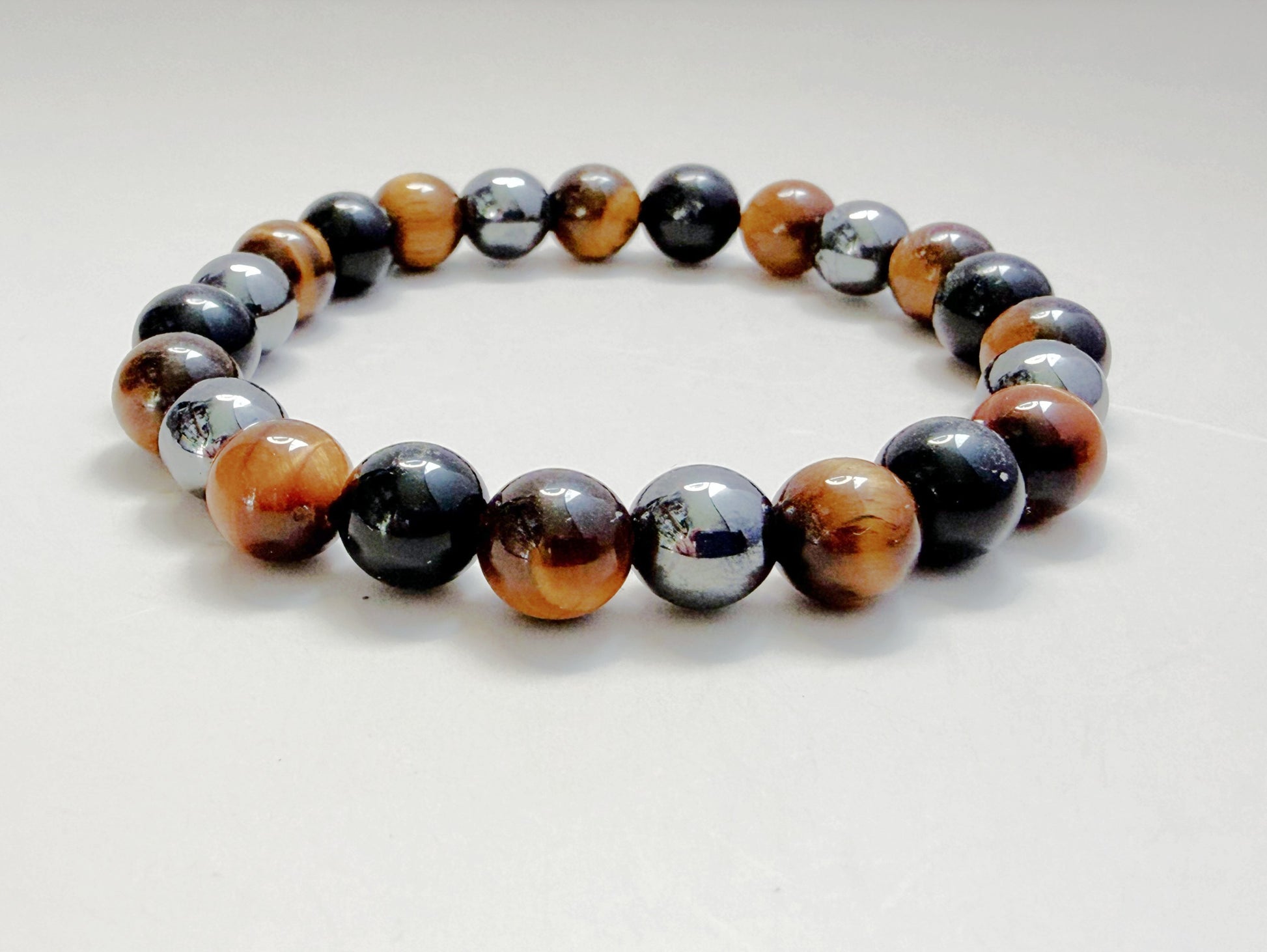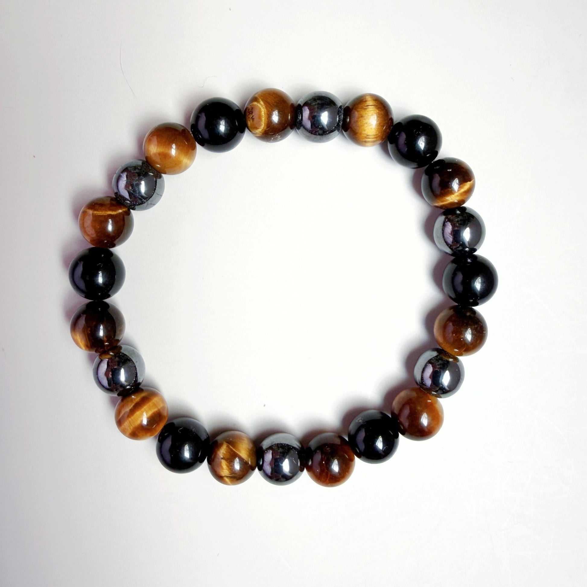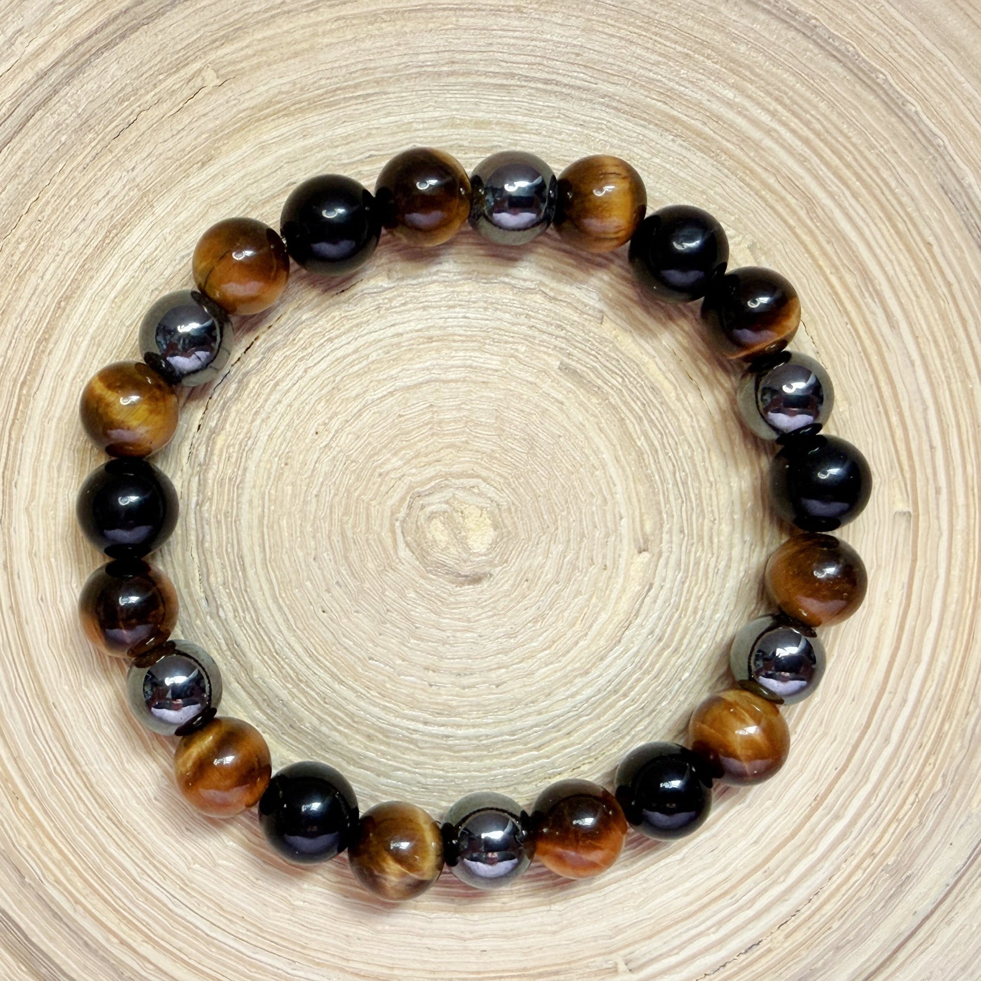 Polished 8mm natural beads create a bold yet wearable look, accented by the rich gold-brown tones of Tiger Eye, the deep black sheen of Obsidian, and the reflective metallic finish of Hematite. Strung on high-quality elastic, this bracelet is comfortable for everyday wear and easy to slip on and off.